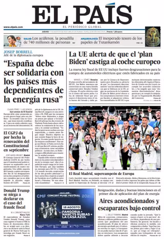 EL PAÍS: "Josep Borrell, jefe de la diplomacia europea: "España debe ser solidaria con los países más dependientes de la energía rusa"; "La UE alerta de que el 'plan Biden' castiga al coche europeo"; "El CGPJ da por hecha la renovación del Constitucional en septiembre"; "Donald Trump se niega a declarar en el caso del fraude fiscal"; "Aires acondicionados y escaparates bajo control".