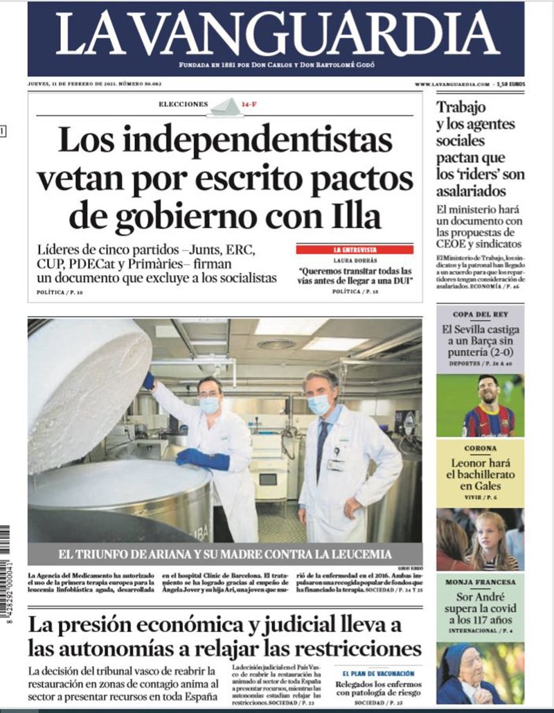LA VANGUARDIA: "Los independentistas vetan por escrito pactos de gobierno con Illa. Laura Borràs: "Queremos transitar todas las vías antes de llegar a una DUI""; "El triunfo de Ariana y su madre contra la leucemia"; "La presión económica y judicial lleva a las autonomías a relajar las restricciones"; "Trabajo y los agentes sociales pactan que los ‘riders’ son asalariados"; "El Sevilla castiga a un Barça sin puntería (2-0)".