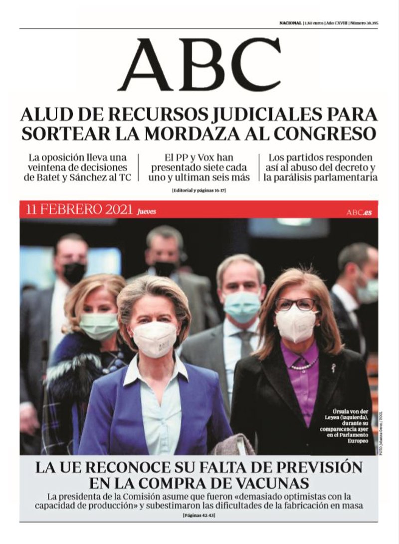 ABC: "Alud de recursos judiciales para sortear la mordaza al Congreso. La oposición lleva una veintena de decisiones de Batet y Sánchez al TC"; "La UE reconoce su falta de previsión en la compra de vacunas. La presidenta de la Comisión asume que fueron "demasiado optimistas con la capacidad de producción" y subestimaron las dificultades de la fabricación en masa".