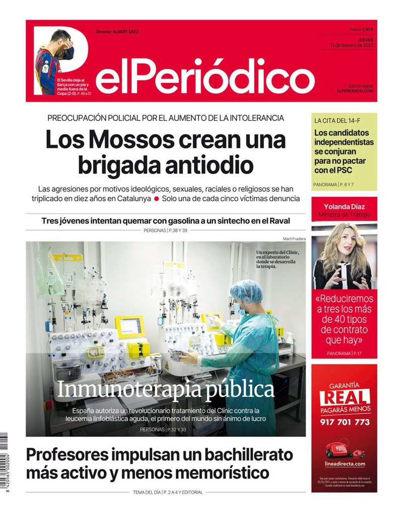 EL PERIÓDICO: "Los Mossos crean una brigada antiodio. Tres jóvenes intentan quemar con gasolina a un sintecho en el Raval"; "Inmunoterapia pública. España autoriza un revolucionario tratamiento del Clínic: contra la leucemia linfoblástica aguda, el primero del mundo sin ánimo de lucro"; "Los candidatos independentistas se conjuran para no pactar con el PSC"; "Yolanda Díaz: "Reduciremos a tres los más de 40 tipos de contrato que hay"".