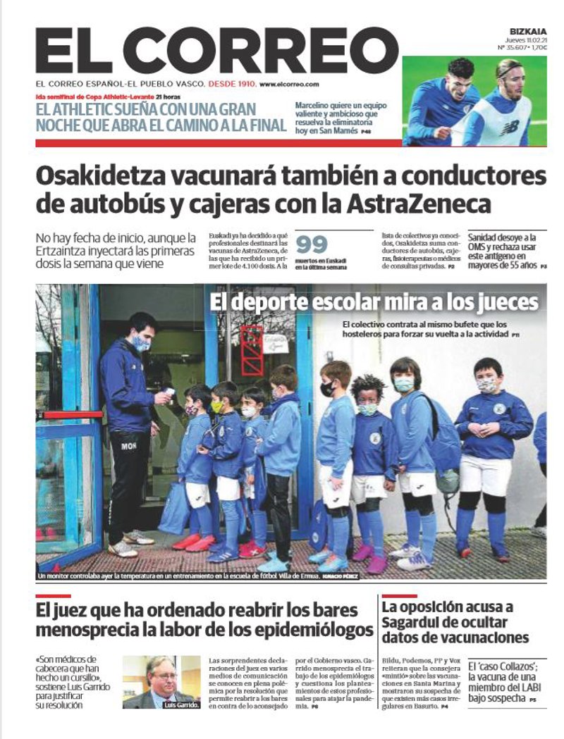 EL CORREO: "Osakidetza vacunará también a conductores de autobús y cajeras con la AstraZeneca"; "El deporte escolar mira a los jueces. El colectivo contrata al mismo bufete que los hosteleros para forzar su vuelta a la actividad"; "El juez que ha ordenado reabrir los bares menosprecia la labor de los epidemiólogos"; "La oposición acusa a Sagardui de ocultar datos de vacunaciones".