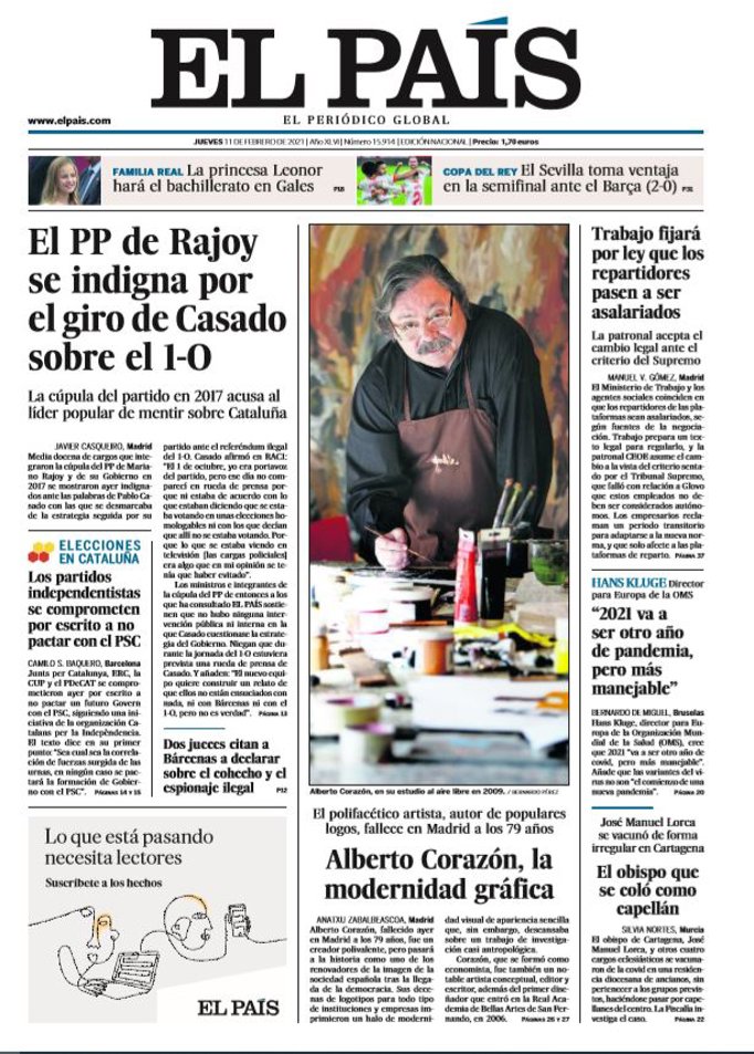 EL PAÍS: El PP de Rajoy se indigna por el giro de Casado sobre el 1-O. La cúpula del partido en 2017 acusa al líder popular de mentir sobre Cataluña"; "Alberto Corazón, la modernidad gráfica. El polifacético artista, autor de populares logos, fallece en Madrid a los 79 años"; "Elecciones en Cataluña. Los partidos independentistas se comprometen por escrito a no pactar con el PSC"; "Dos jueces citan a Bárcenas a declarar sobre el cohecho y el espionaje ilegal"; "Trabajo fijará por ley que los repartidores pasen a ser asalariados"; "Hanskluged, director para Europa de la OMS: "2021 va a ser otro año de pandemia, pero más manejable""; "El obispo que se coló como capellán. José Manuel Lorca se vacunó de forma irregular en Cartagena".