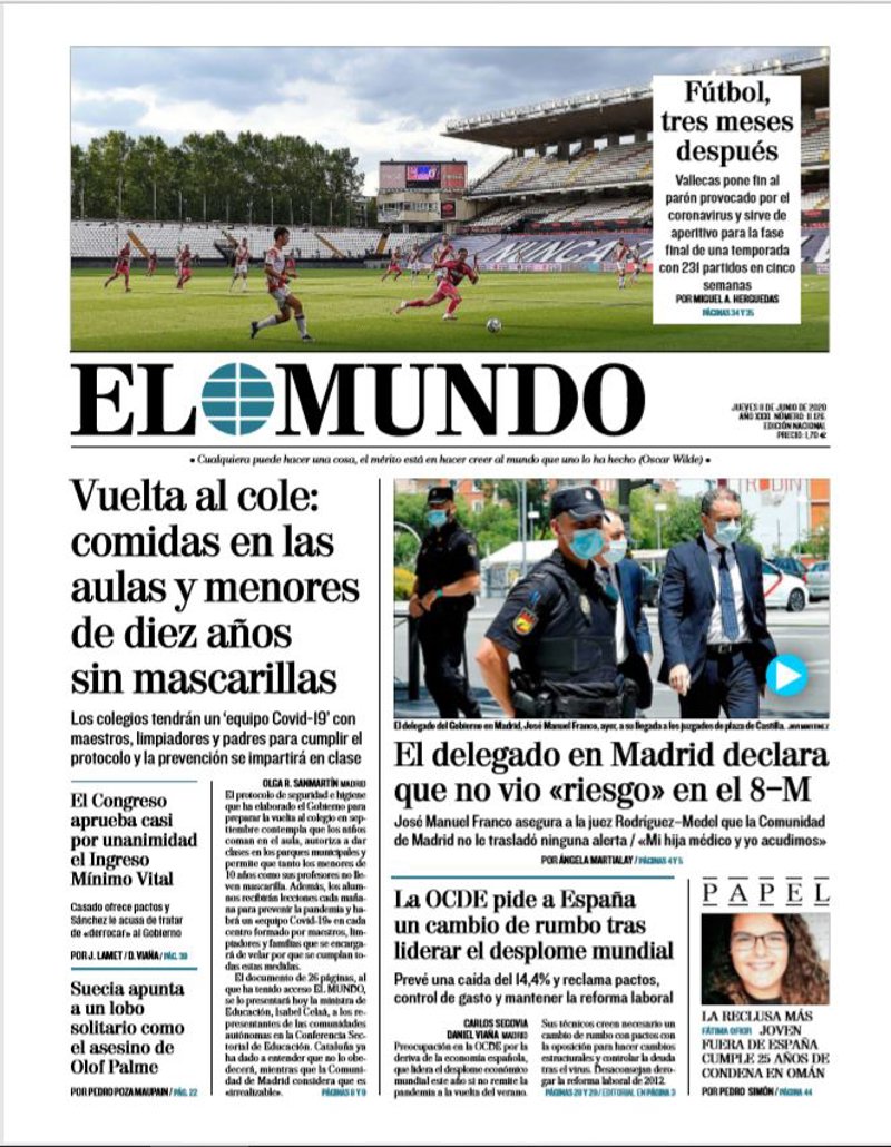 EL MUNDO: "Fútbol, tres meses después. Vallecas pone fin al parón provocado por el coronavirus y sirve de aperitivo para la fase final de una temporada con 231 partidos en cinco"; "Vuelta al cole: comidas en las aulas y menores de diez años sin mascarillas"; "El delegado en Madrid declara que no vio "riesgo" en el 8-M"; "La OCDE pide a España un cambio de rumbo tras liderar el desplome mundial"; "El Congreso aprueba casi por unanimidad el Ingreso Mínimo Vital"; "Suecia apunta a un lobo solitario como el asesino de Olof Palme".
