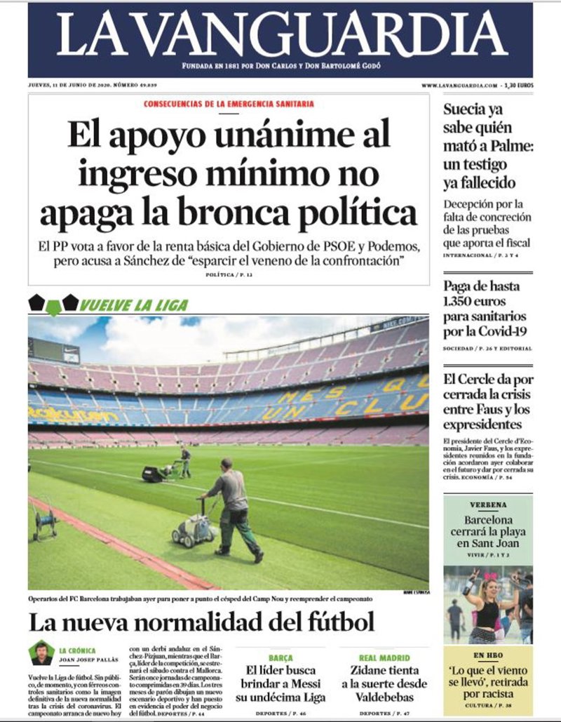 LA VANGUARDIA: "El apoyo unánime al ingreso mínimo no apaga la bronca política"; "La vuelta a la normalidad del fútbol"; "Suecia ya sabe quién mató a Palme: un testigo ya fallecido"; "Paga de hasta 1.350 euros para sanitarios por la Covid-19"; "El Cercle da por cerrada la crisis entre Faus y los expresidentes".