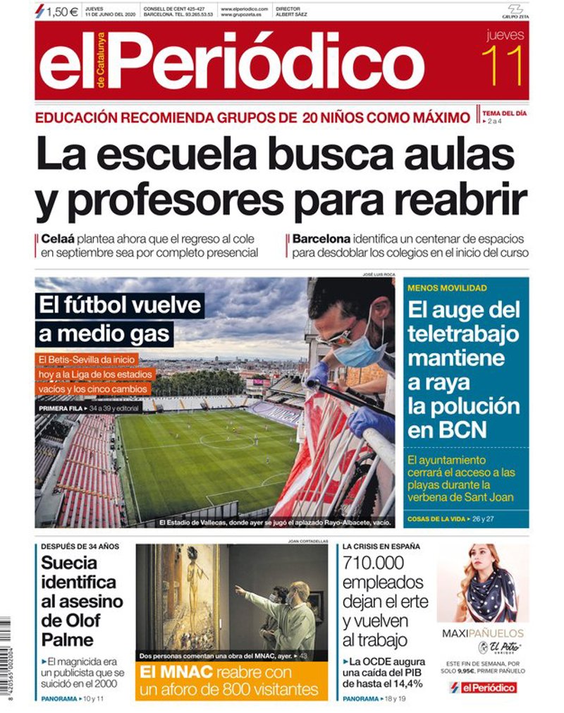 EL PERIÓDICO: "La escuela busca aulas y profesores para reabrir"; "El fútbol vuelve a medio gas. El Betis-Sevilla da inicio hoy a la Liga de los estadios vacíos y los cinco cambios"; "El auge del teletrabajo mantiene a raya la polución en BCN"; "Suecia identifica al asesino de Olof Palme"; "El MNAC reabre con un aforo de 800 visitantes"; "710.000 empleados dejan el erte y vuelven al trabajo".