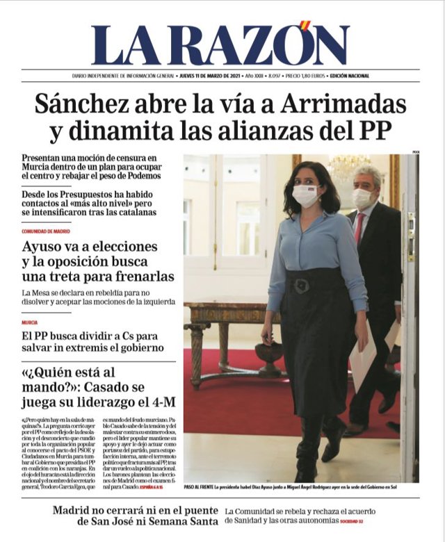 LA RAZÓN: "Sánchez abre la vía a Arrimadas y dinamita las alianzas del PP"; "Ayuso va a elecciones y la oposición busca una treta para frenarlas"; "El PP busca dividir a Cs para salvar in extremis el gobierno"; ""¿Quién está al mando?": Casado se juega su liderazgo el 4-M"; "Madrid no cerrará ni en el puente de San José ni Semana Santa".
