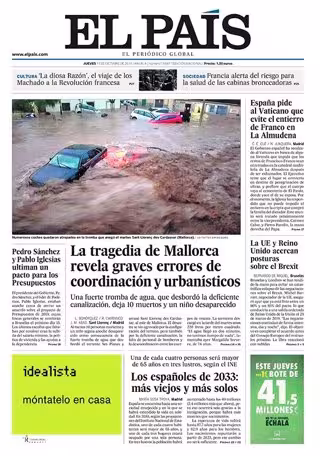 EL PAÍS: "La tragedia de Mallorca revela graves errores de coordinación y urbanísticos"; "Pedro Sánchez y Pablo Iglesias ultiman un pacto para los Presupuestos"; "España pide al Vaticano que evite el entierro de Franco en La Almudena"; "La UE y Reino Unido acercan posturas sobre el Brexit".