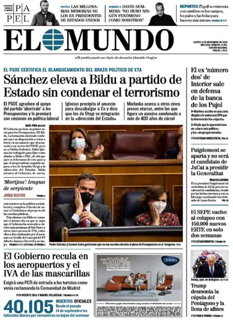 EL MUNDO: "Sánchez eleva a Bildu a partido de Estado sin condenar el terrorismo"; "El Gobierno recula en los aeropuertos y el IVA de las mascarillas"; "El ex 'número dos' de Interior sale en defensa de la banca de los Pujol"; "Puigdemont se aparta y no será el candidato de JxCat a presidir la Generalitat"; "El SEPE vuelve al colapso con 150.000 nuevos ERTE en solo dos semanas".