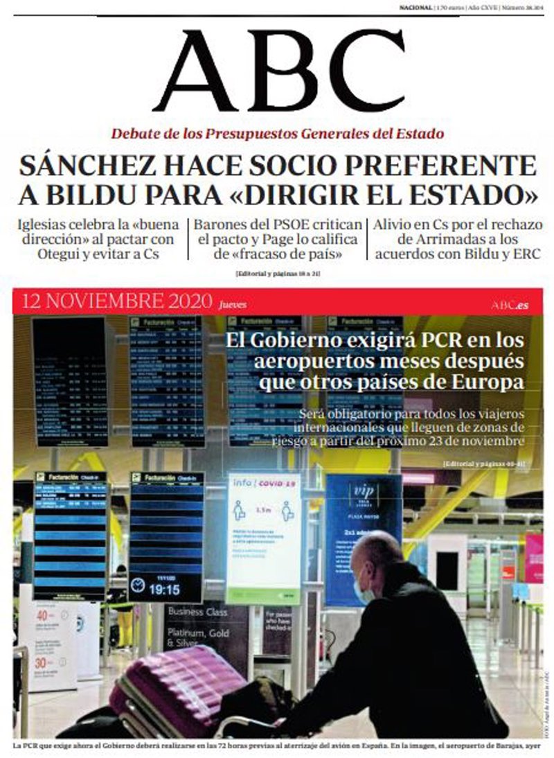 ABC: "Sánchez hace socio preferente a Bildu para "dirigir el Estado"; "El Gobierno exigirá PCR en los aeropuertos meses después que otros países de Europa. Será obligatorio para todos los viajeros internacionales que lleguen de zonas de riesgo a partir del próximo 23 de noviembre".