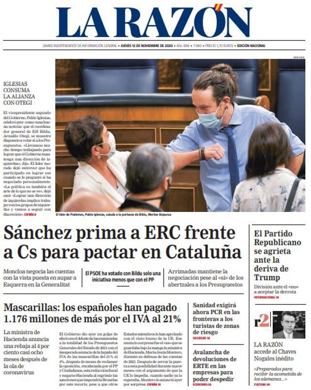 LA RAZÓN: "Sánchez prima a ERC frente a Cs para pactar en Cataluña"; "Mascarillas: los españoles han pagado 1.176 millones de más por el IVA al 21%"; "Sanidad exigirá ahora PCR en las fronteras a los turistas de zonas de riesgo"; "Avalancha de devoluciones de ERTE en las empresas para poder despedir"; "El Partido Republicano se agrieta ante la deriva de Trump".