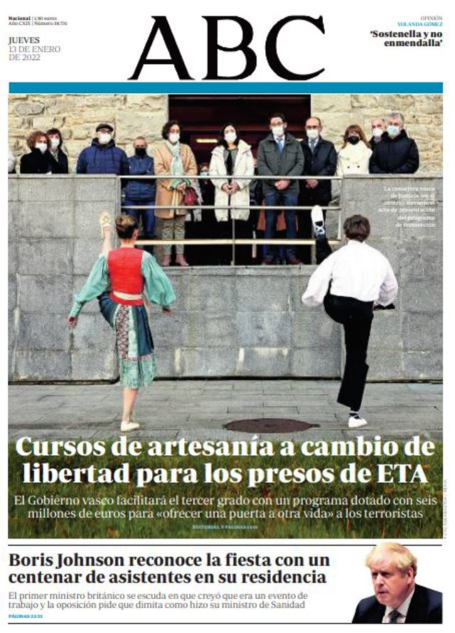 ABC:"Cursos de artesanía a cambio de libertad para los presos de ETA"; "Boris Johnson reconoce la fiesta con un centenar de asistentes en su residencia".