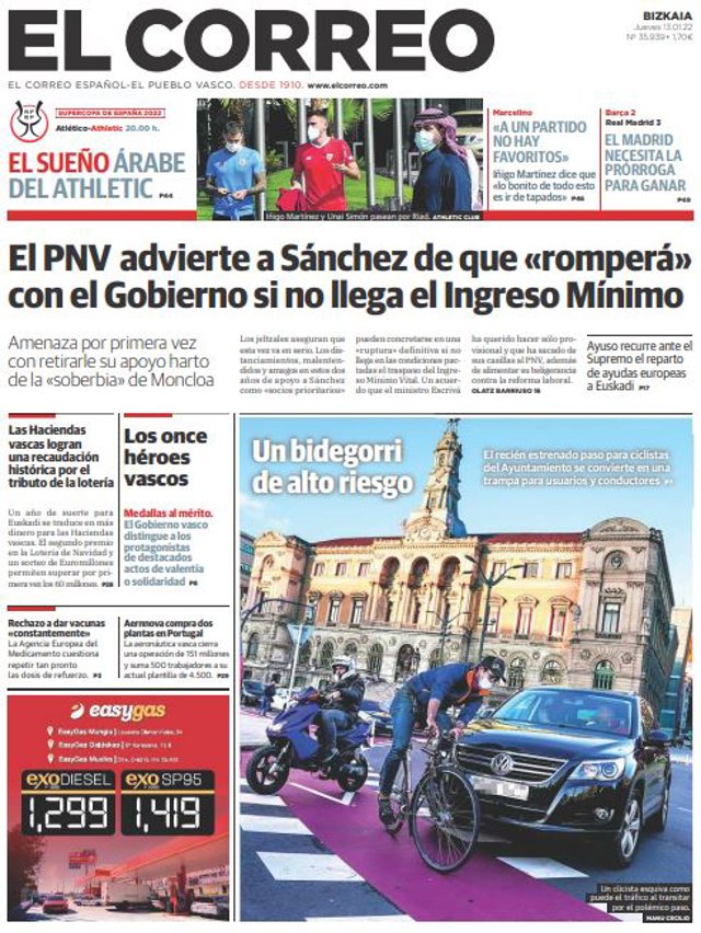 EL CORREO: "El PNV advierte a Sánchez de que 'romperá' con el Gobierno si no llega el Ingreso Mínimo"; "Las Haciendas vascas logran una recaudación histórica por el tributo de la lotería"; "Los once héroes vascos".