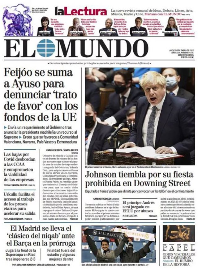 EL MUNDO: "Feijóo se suma a Ayuso para denunciar 'trato de favor' con los fondos de la UE"; "Johnson tiembla por su fiesta prohibida en Downing Street"; "El Madrid se lleva el 'clásico del niqab' ante el Barça en la prórroga".