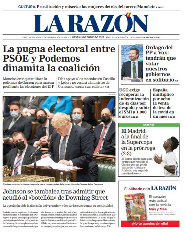 LA RAZÓN: "La pugna electoral entre PSOE y Podemos dinamita la coalición"; "Órdago del PP a Vox: tendrán que votar nuestros gobiernos en solitario"; "Johnson se tambalea tras admitir que acudió al 'botellón' de Downing Street"; "UGT exige recuperar la