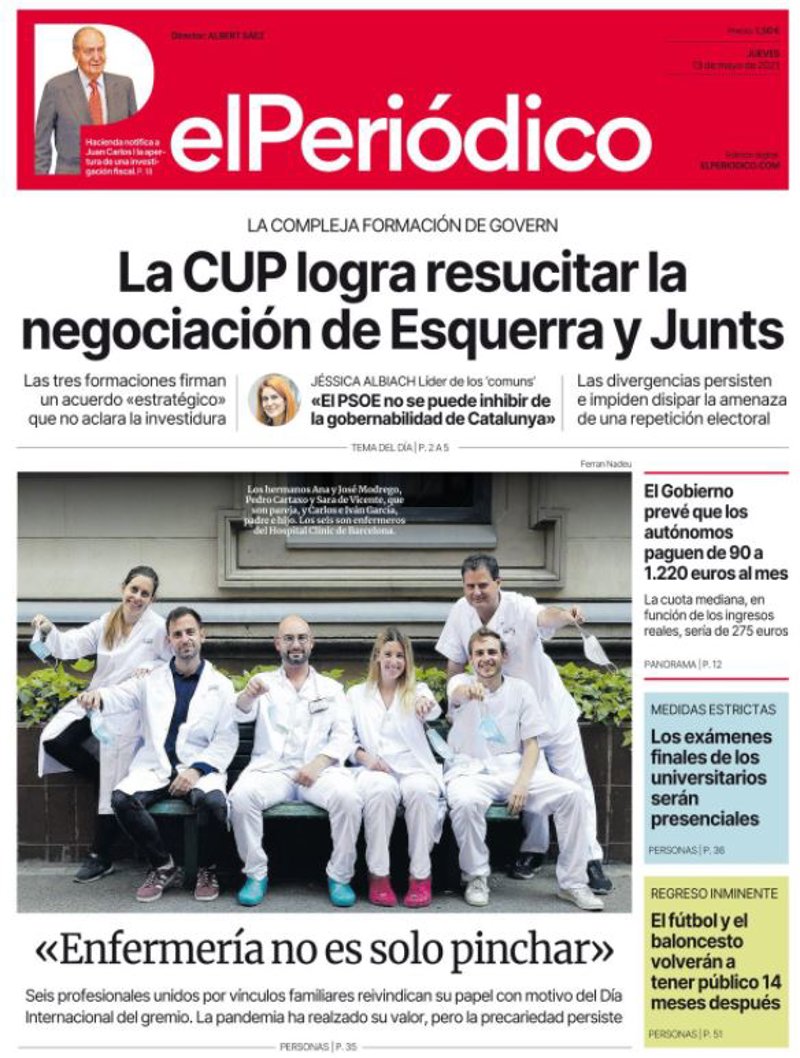 EL PERIÓDICO: "La CUP logra resucitar la negociación de Esquerra y Junts"; "El Gobierno prevé que los autónomos paguen de 90 a 1.220 euros al mes"; "Los exámenes finales de los universitarios serán presenciales"; "'Enfermería no es solo pinchar'"; "El fútbol y el baloncesto volverán a tener público 14 meses después".