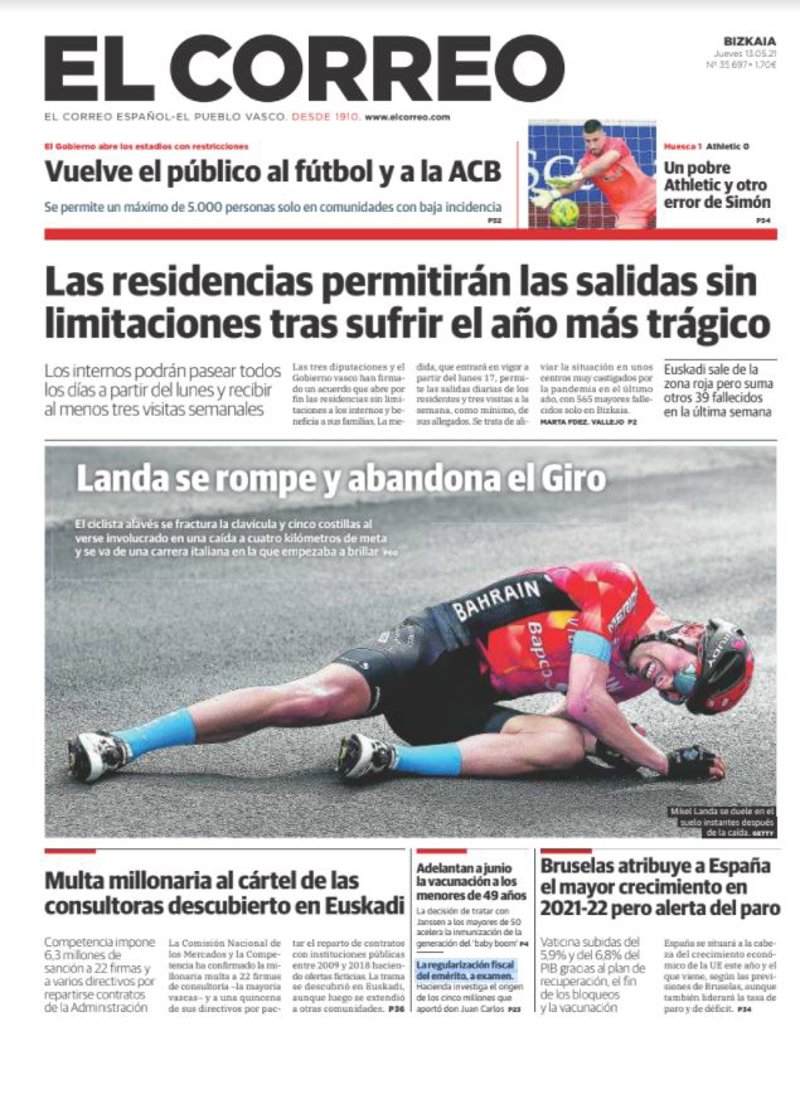 EL CORREO: "Las residencias permitirán las salidas sin limitaciones tras sufrir el año más trágico"; "Vuelve el público al fútbol y a la ACB"; "Landa se rompe y abandona el Giro"; "Multa millonaria al cártel de las consultoras descubierto en Euskadi"; "Un pobre Athletic y otro error de Simón"; "Bruselas atribuye a España el mayor crecimiento en 2021-22 pero alerta del paro"; "Adelantan a junio la vacunación a los menores de 49 años"; "La regularización fiscal del emérito, a examen".