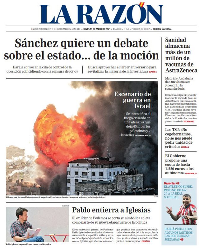LA RAZÓN: "Sánchez quiere un debate sobre el estado... de la moción"; "Pablo entierra a Iglesias"; "Sanidad almacena más de un millón de vacunas de AstraZeneca"; "Los TSJ: "No cogobernamos, no se nos puede pedir unidad de criterio""; "El Gobierno propone una cuota de hasta 1.220 euros a los autónomos".