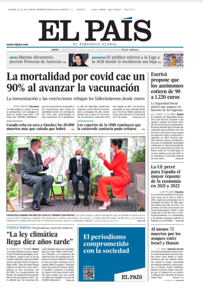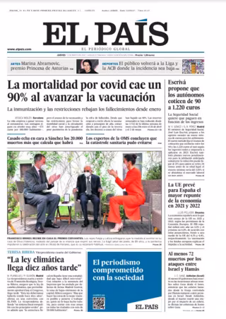 EL PAÍS: "La mortalidad por covid cae un 90% al avanzar la vacunación"; "Escrivá propone que los autónomos coticen de 90 a 1.220 euros"; "Teresa Ribera: 'La ley climática llega diez años tarde'"; "La UE prevé para España el mayor repunte de la economía en 2021 y 2022"; "Al menos 72 muertos por los ataques entre Israel y Hamás"; "Marina Abramovic, premio Princesa de Asturias"; "El público volverá a la Liga y la ACB donde la incidencia sea baja".
