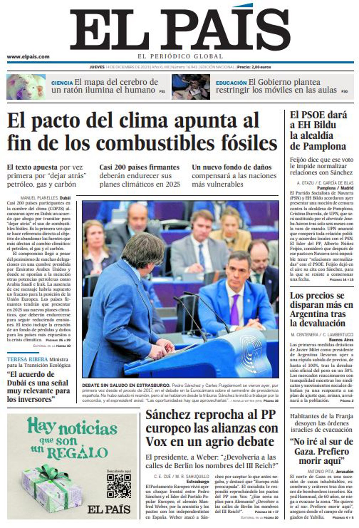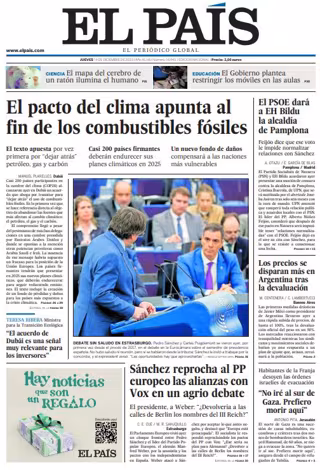 EL PAÍS: "El pacto del clima apunta al fin de los combustibles fósiles"; "Sánchez reprocha al PP europeo las alianzas con Vox en un agrio debate"; "El PSOE dará a EH Bildu la alcaldía de Pamplona"; "Los precios se disparan más en Argentina tras la devaluación"; ""No iré al sur de Gaza. Prefiero morir aquí"".
