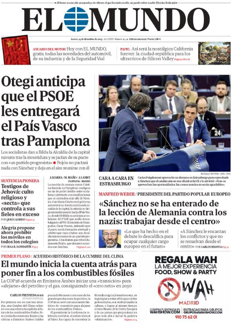 EL MUNDO: "Otegi anticipa que el PSOE les entregará el País Vasco tras Pamplona"; "Testigos de Jehová: culto religioso y "secta" que controla a sus fieles en exceso"; "Alegría propone ahora prohibir los móviles en todos los colegios"; "El mundo inicia la cuenta atrás para poner fin a los combustibles fósiles"; "Manfred Webber: "Sánchez no se ha enterado de la lección de Alemania contra los nazis: trabajar desde el centro"".