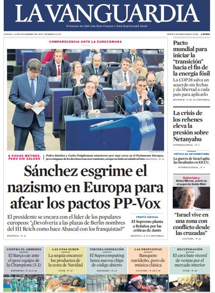 LA VANGUARDIA: "Sánchez esgrime el nazismo en Europa para afear los pactos PP-Vox"; "Pacto mundial para iniciar la "transición" hacia el fin de la energía fósil"; "La crisis de los rehenes eleva la presión sobre Netanyahu"; "Entrevista a Helen Mirren, actriz en el papel de Golda Mei: "Israel vive en una zona con conflicto desde las cruzadas".