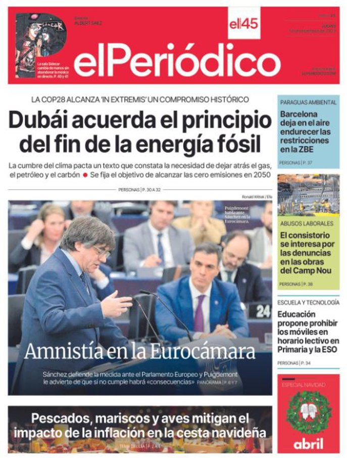 EL PERIÓDICO: "Dubái acuerda el principio del fin de la energía fósil"; "Amnistía en la Eurocámara"; "Barcelona deja en el aire endurecer las restricciones en la ZBE".