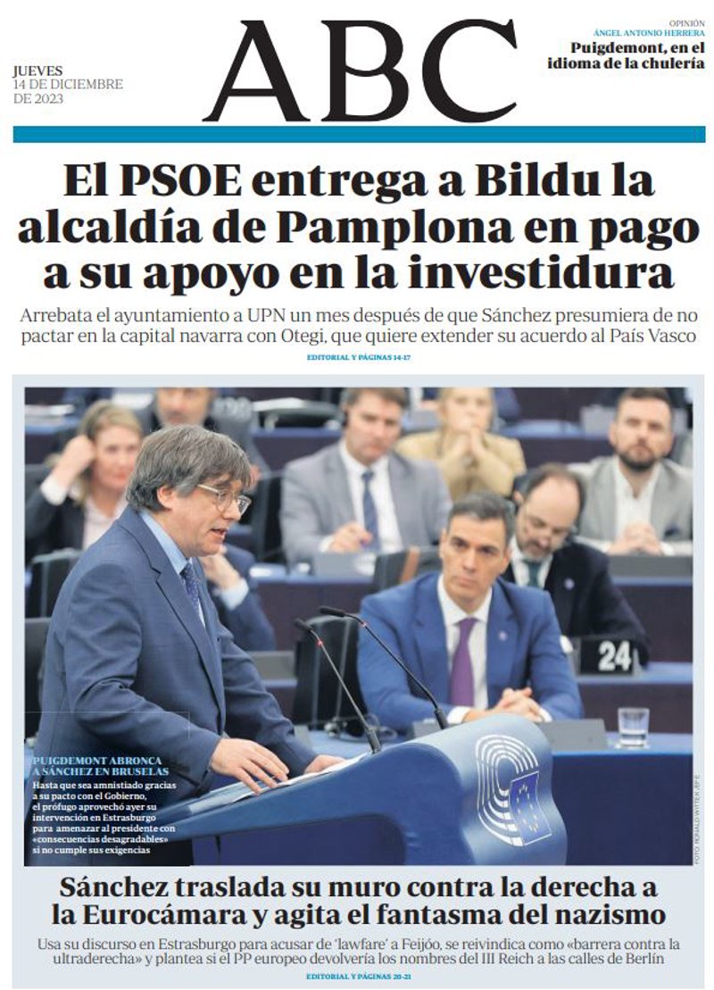 ABC: "El PSOE entrega a Bildu la alcaldía de Pamplona en pago a su apoyo en la investidura. Arrebata el ayuntamiento a UPN un mes después de que Sánchez presumiera de no pactar en la capital navarra con Otegi, que quiere extender su acuerdo al País Vasco"; "Sánchez traslada su muro contra la derecha a la Eurocámara y agita el fantasma del nazismo. Usa su discurso en Estrasburgo para acusar de 'lawfare' a Feijóo, se reivindica como "barrera contra la ultraderecha" y plantea si el PP europeo devolvería los nombres del III Reich a las calles de Berlín".