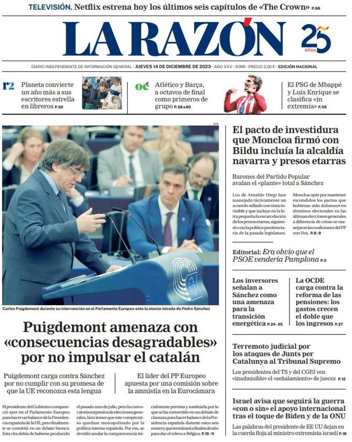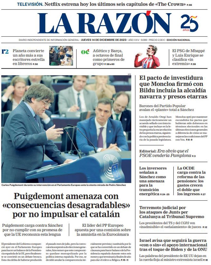 LA RAZÓN: "Puigdemont amenaza con "consecuencias desagradables" por no impulsar el catalán"; "El pacto de investidura que Moncloa firmó con Bildu incluía la alcaldía navarra y presos etarras"; "Los inversores señalan a Sánchez como una amenaza para la transición energética"; "La OCDE carga contra la reforma de las pensiones: los gastos crecen el doble que los ingresos"; "Terremoto judicial por los ataques de Junts per Catalunya al Tribunal Supremo"; "Israel avisa que seguirá la guerra "con o sin" el apoyo internacional tras el toque de Biden y de la ONU".