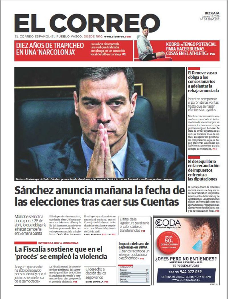 EL CORREO: "Sánchez anuncia mañana la fecha de las elecciones tras caer sus Cuentas"; "La Fiscalía sostiene que en el 'procés' se empleó la violencia"; "El Renove vasco obliga a los concesionarios a adelantar la rebaja anunciada"; "El desequilibrio en la recaudación de impuestos enfrenta a las diputaciones".