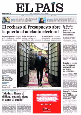 EL PAÍS: "El rechazo al Presupuesto abre la puerta al adelanto electoral"; "La Fiscalía: 'Este es un juicio en defensa de la democracia'"; "España es el país de Europa con más contratos de menos de seis meses"; "Eduardo Zaplana cobró más de 10 millones en sobornos, según la Guardia Civil".