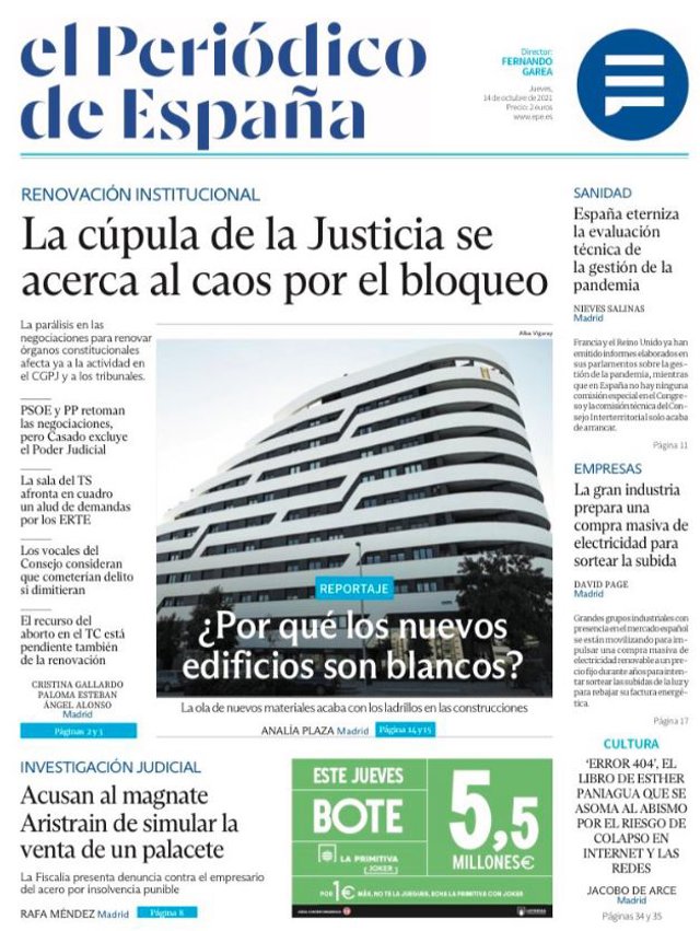 EL PERIÓDICO DE ESPAÑA: "La cúpula de la Justicia se acerca al caos por el bloqueo"; "¿Por qué los nuevos edificios son blancos?"; "Acusan al magnate Aristrain de simular la venta de un palacete"; "España eterniza la evaluación técnica de la gestión de la pandemia"; "La gran industria prepara una compra masiva de electricidad para sortear la electricidad".