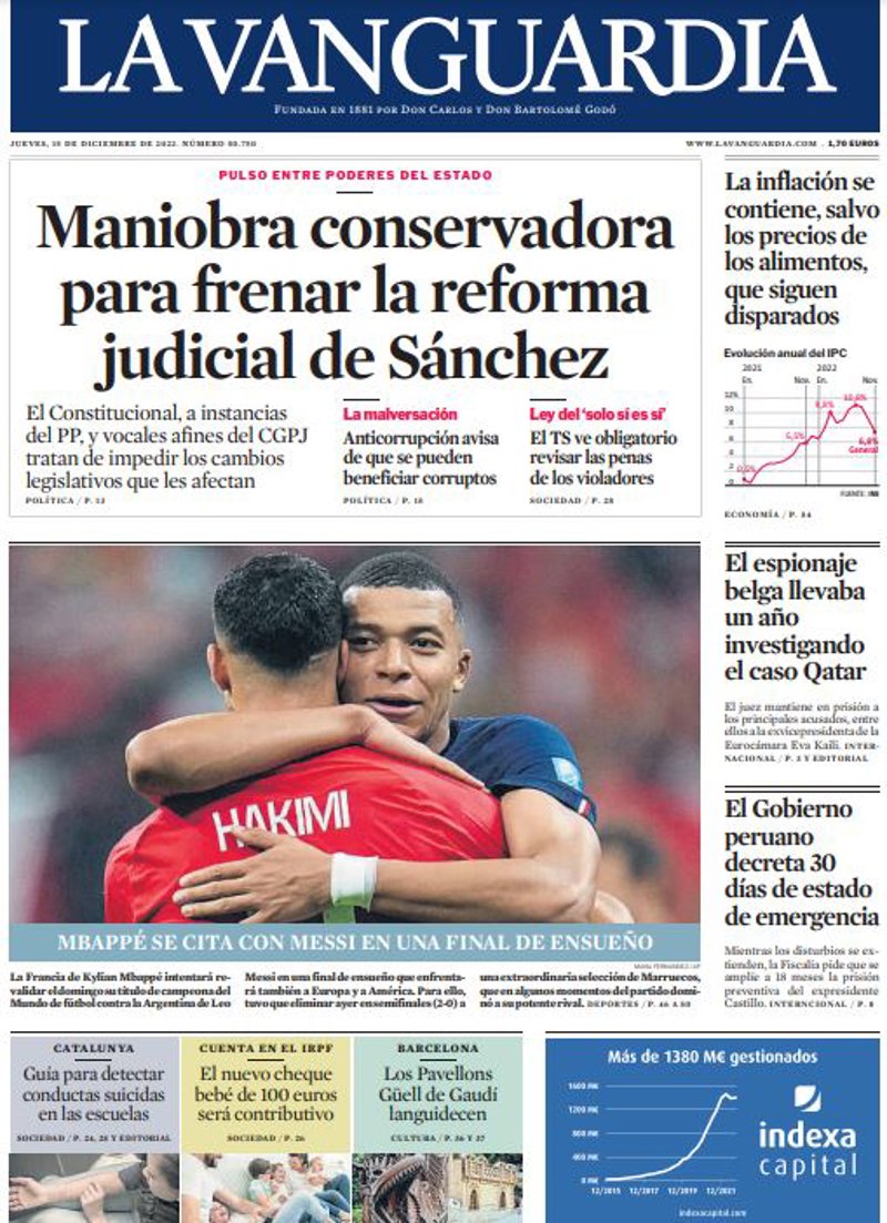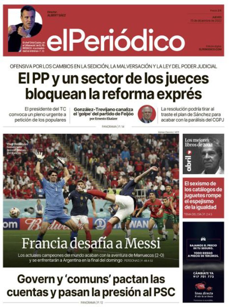 EL PAÍS: "El Constitucional decide hoy si frena su reforma en el Congreso"; "La Francia de Mbappé se cita en la final con la Argentina de Messi"; "El 'Qatargate' destapa la injerencia de varios países en la UE"; "Competencia investiga a las petroleras por las rebajas en