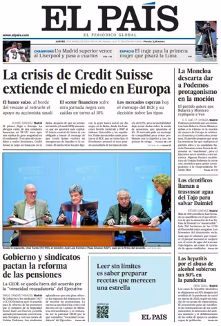EL PAÍS: "La crisis de Credit Suisse extiende el miedo en Europa"; "Gobierno y sindicatos pactan la reforma de las pensiones"; "La Moncloa descarta dar a Podemos protagonismo en la moción"; "Los científicos llaman a trasvasar agua del Tajo para salvar Daimiel"; "Las hepatitis por el abuso de alcohol subieron un 50% en la pandemia".