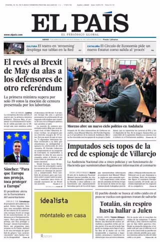 EL PAÍS: "El revés al Brexit de May da alas a los defensores de otro referéndum"; "Imputados seis topos de la red de espionaje de Villarejo"; "Moreno abre un nuevo ciclo político en Andalucía"; "Sánchez: 'Para que Europa nos proteja, toca proteger a Europa'"; "Totalán, sin respiro hasta hallar a Julen".