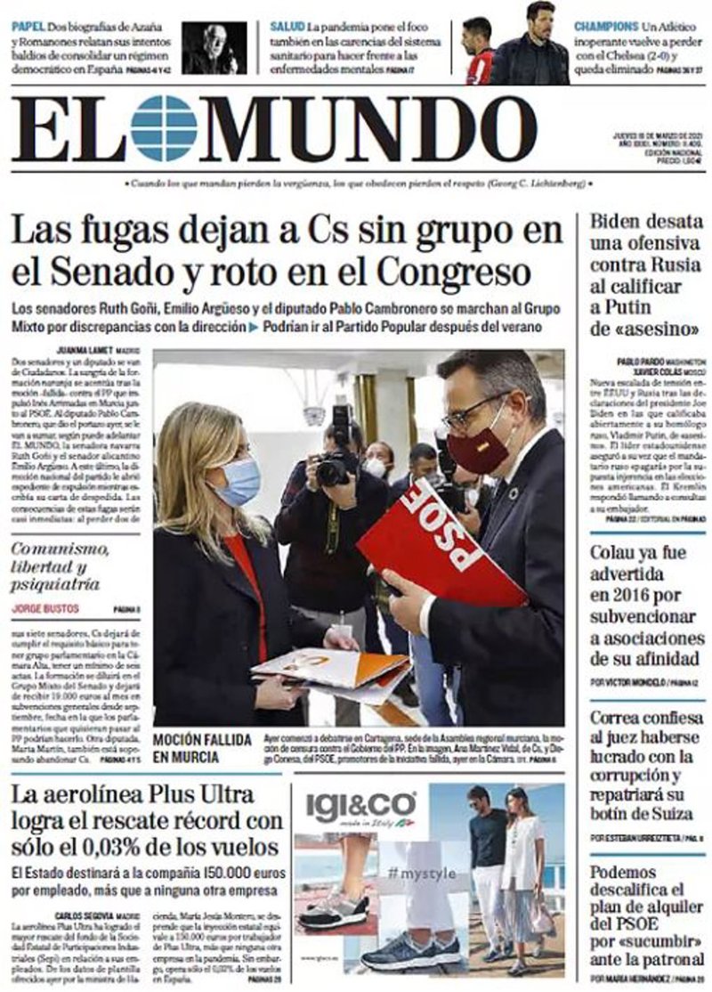 EL MUNDO: "Las fugas dejan a Cs sin grupo en el Senado y roto en el Congreso"; "La aerolínea Plus Ultra logra el rescate récord con sólo el 0,03% de los vuelos"; "Biden desata una ofensiva contra Rusia al calificar a Putin de "asesino""; "Colau ya fue advertida en 2016 por subvencionar a asociaciones de su afinidad"; "Correa confiesa al juez haberse lucrado con la corrupción y repatriará su botín de Suiza"; "Podemos descalifica el plan de alquiler del PSOE por "sucumbir" a la patronal".