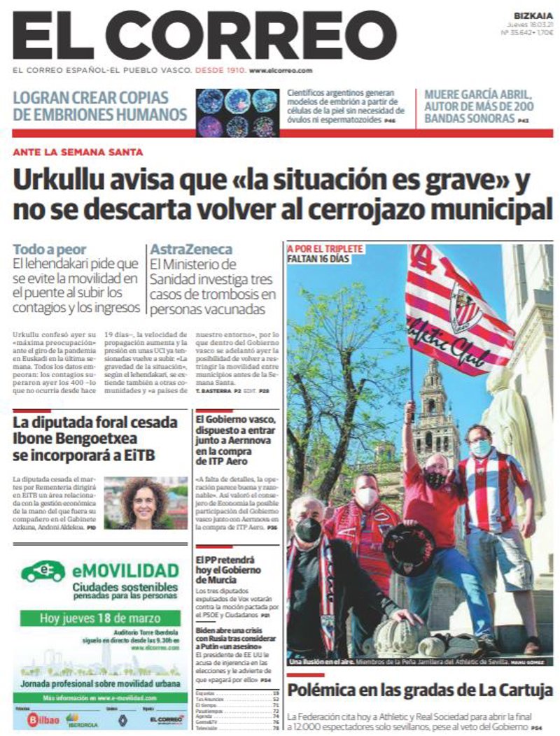 EL CORREO: "Urkullu avisa que "la situación es grave" y no se descarta volver al cerrojazo municipal""; "La diputada foral cesada Ibone Bengoetxea se incorporará a EiTB"; "El Gobierno vasco, dispuesto a entrar junto a Aernnova en la compra de ITP Aero"; "El PP retendrá hoy el Gobierno de Murcia"; "Biden abre una crisis con Rusia tras considerar a Putin "un asesino""; "Polémica en las gradas de La Cartuja".
