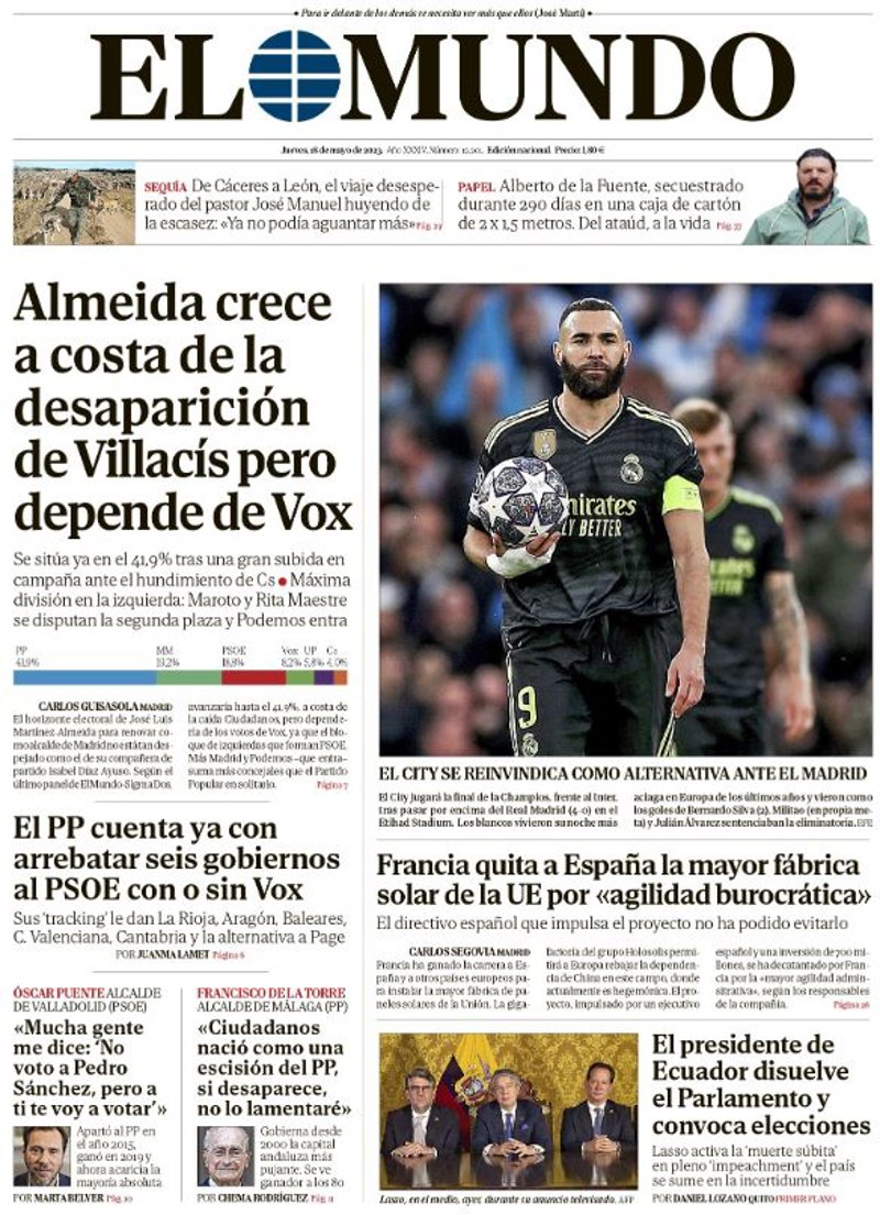 EL MUNDO: "Almeida crece a costa de la desaparición de Villacís pero depende Vox"; "El PP cuenta ya con arrebatar seis gobiernos al PSOE con o Sin Vox"; "Óscar Puente: "Mucha gente me dice: 'No voto a Pedro Sánchez, pero a ti te voy a votar""; "Francisco de la Torre: "Ciudadanos nació como una escisión del PP, si desaparece, no lo lamentaré""; "Francia quita a España la mayor fábrica solar de la UE por "agilidad democrática"; "El presidente de Ecuador disuelve el Parlamento y convoca elecciones".