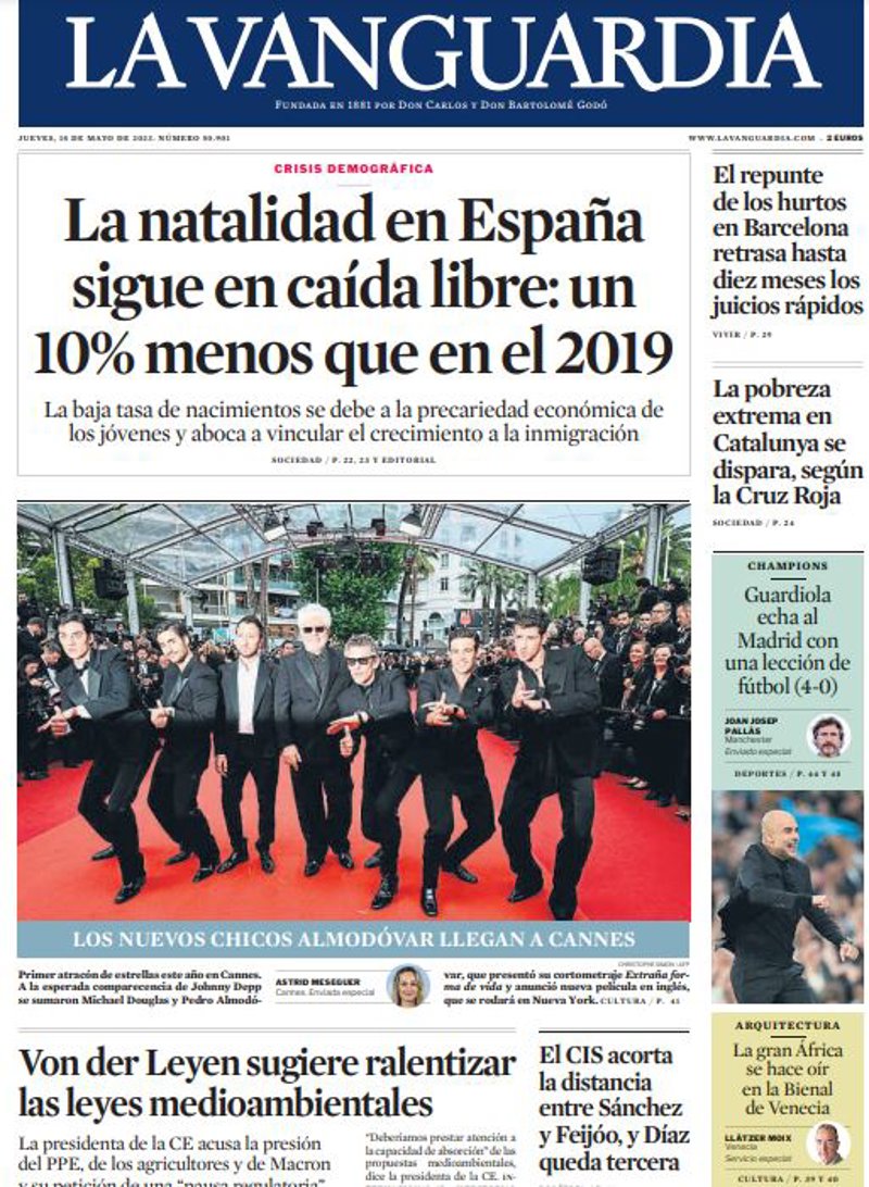 LA VANGUARDIA: "La natalidad en España sigue en caída libre: un 10% menos que en el 2019"; "Von der Leyen sugiere ralentizar las leyes medio ambientales"; "El repunte de los hurtos en Barcelona retrasa hasta diez meses los juicios rápidos"; "La pobreza extrema en