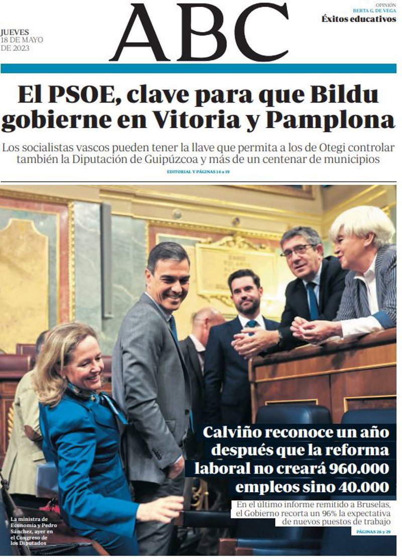 ABC: "El PSOE, clave para que Bildu gobierne en Vitoria y Pamplona. Los socialistas vascos pueden tener la llave que permita a los de Otegi controlar también la Diputación de Guipúzcoa y más de un centenar de municipios"; "Calviño reconoce un año después que la reforma laboral no creará 960.000 empleos sino 40.000. En el último informe remitido a Bruselas, el Gobierno recorta un 96% la expectativa de nuevos puestos de trabajo".
