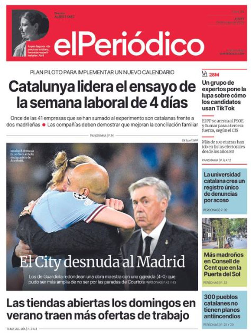 EL PERIÓDICO: "Catalunya lidera el ensayo de la semana laboral de 4 días"; "El City desnuda al Madrid"; "Las tiendas abiertas los domingos en verano traen más oferta"; "Un grupo de expertos pone la lupa sobre cómo los candidatos usan TikTok"; "La universidad catalana crea un registro único de denuncias por acoso".