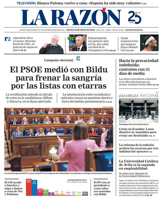 LA RAZÓN: "El PSOE medió con Bildu para frenar la sangría por las listas con etarras"; "Hacia la precariedad indefinida: contratos con 51 días de media"; "Crisis en Ecuador: Lasso disuelve la Asamblea para evitar ser destituido"; "La reforma de la sedición archiva los recursos por tres indultos del "procés""; "La Universidad Católica de Ávila es la segunda en empleabilidad".