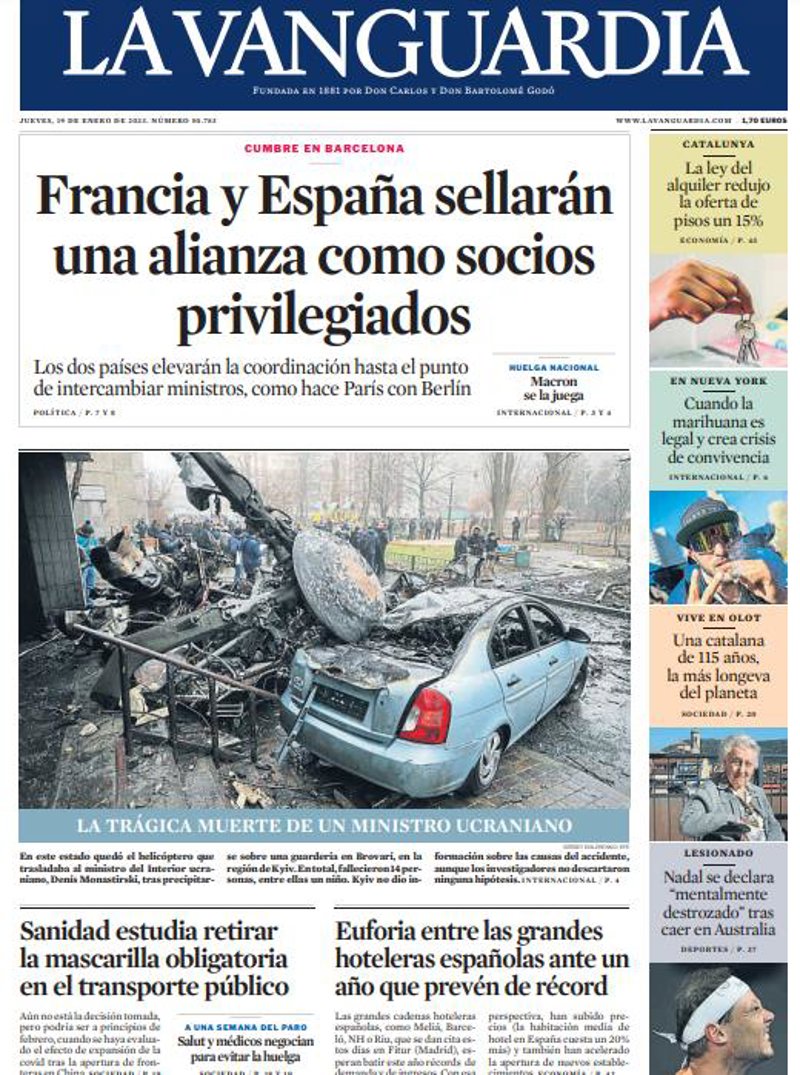 LA VANGUARDIA: "Francia y España sellarán una alianza como socios privilegiados"; "Sanidad estudia retirar la mascarilla obligatoria en el transporte público"; "Euforia entre las grandes hoteleras españolas ante un año que prevén de récord".