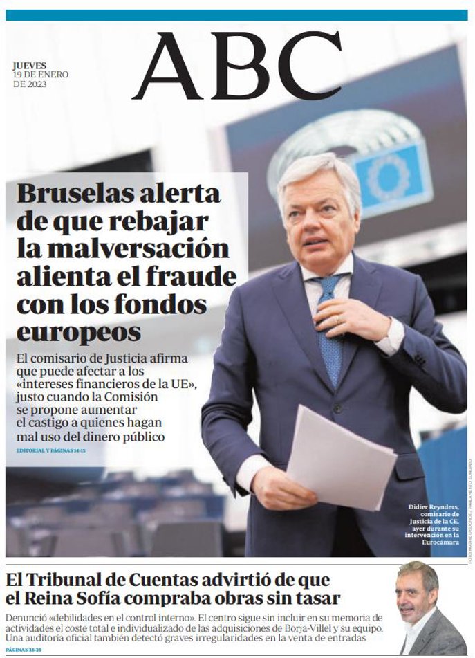 ABC: "Bruselas alerta de que rebajar la malversación alienta el fraude con los fondos europeos"; "El Tribunal de Cuentas advirtió de que el Reina Sofía compraba obras sin tasar".