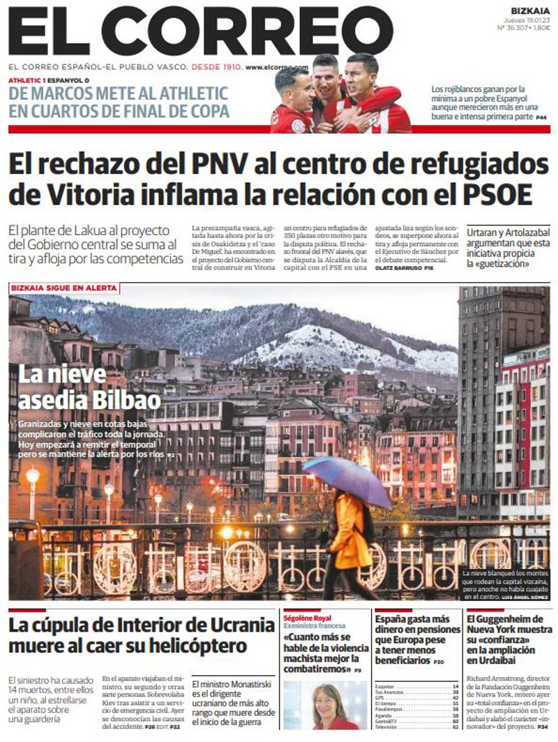 EL CORREO: "El rechazo del PNV al centro de refugiados de Vitoria inflama la relación con el PSOE"; "La cúpula de Interior de Ucrania muere al caer su helicóptero"; "España gasta más dinero en pensiones que Europa pese a tener menos beneficiarios"; "El Guggenheinm de Nueva York muestra su "confianza" en la ampliación de Urdaibai".
