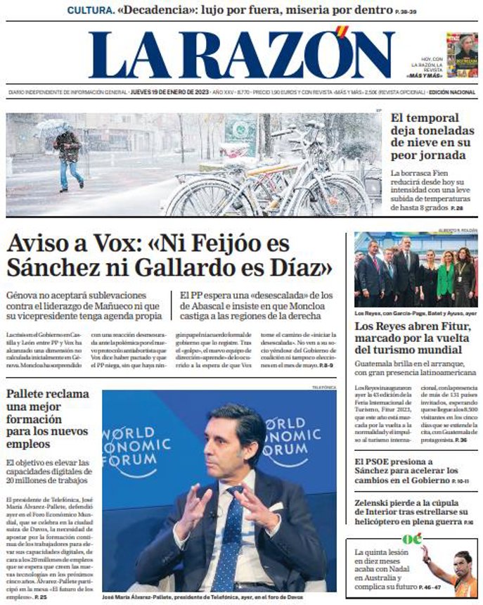 LA RAZÓN: "Aviso a Vox: "Ni Feijóo es Sánchez ni Gallardo es Díaz""; "Pallete reclama una mejor formación para los nuevos empleos"; "El temporal deja toneladas de nieve en su peor jornada"; "Los Reyes abren Fitur, marcado por la vuelta del turismo mundial"; "El PSOE presiona a Sánchez para acelerar los cambios en el Gobierno"; "Zelenski pierde a la cúpula de Interior tras estrellarse su helicóptero en plena guerra".