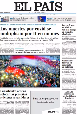EL PAÍS: "Las muertes por covid se multiplican por 11 en un mes"; "Lukashenko ordena sofocar las protestas y detener a sus líderes"; "Los profesores de Madrid van a la huelga en la vuelta al colegio"; "Ciudadanos releva a su candidata en Cataluña"; "Apple, la empresa de los dos billones de dólares".