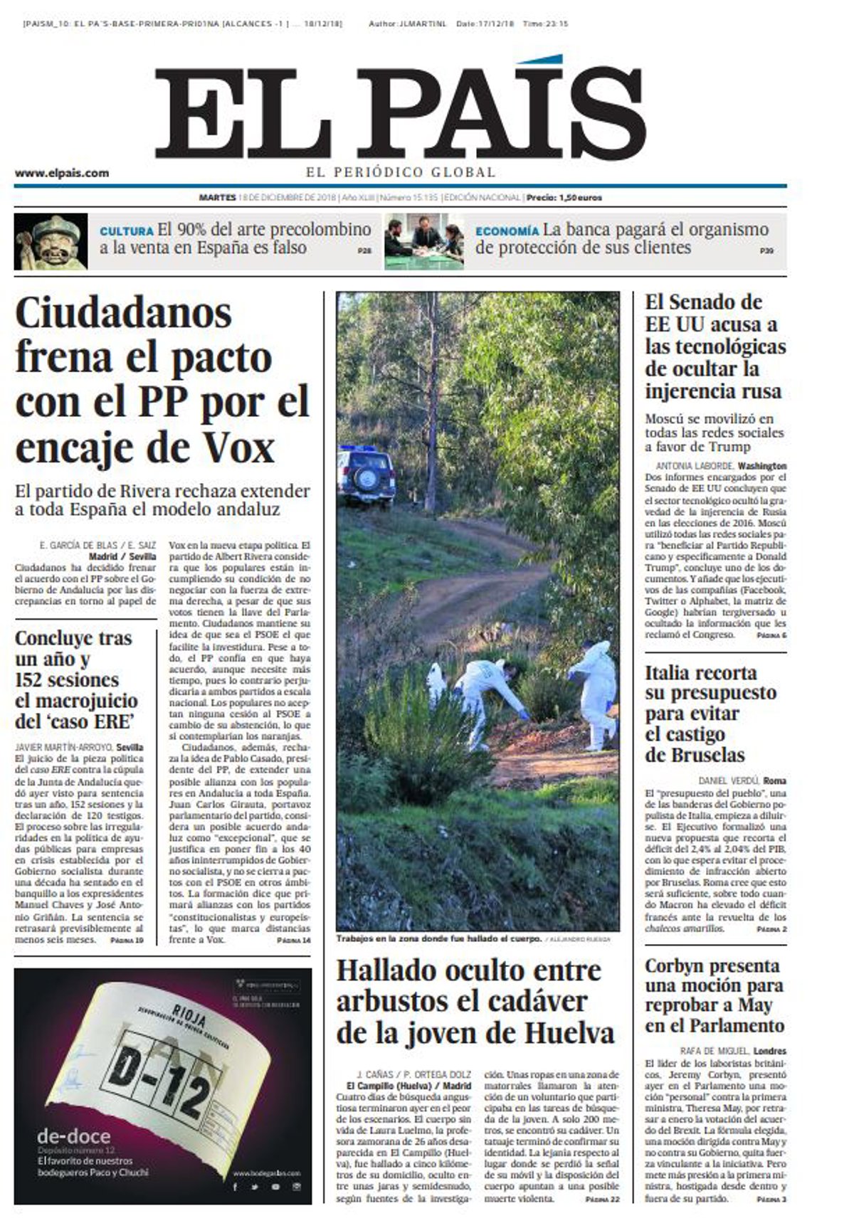 EL PAÍS: "Los expresidentes de la Generalitat piden el fin de la huelga de hambre"; "Alemania busca extranjeros para 1,2 millones de empleos"; "La Guardia Civil cree que Montoya retuvo y violó en su casa a Luelmo"; "El Constitucional vuelve a fallar contra Rajoy por burlar debates parlamentarios"; "Europa prohíbe el plástico de cubiertos, pajitas o bastoncillos".