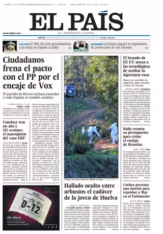 EL PERIÓDICO: "Sánchez y Torra intentan preservar los puentes"; "El Ejecutivo logrará hoy apoyo en el Congreso para subir el déficit"; "El asesino confeso violó a Laura"; "Trump retira las tropas de Siria y deja vía libre a Rusia e Irán"; "Podemos tumbará la ley del alquiler si no limita los precios".