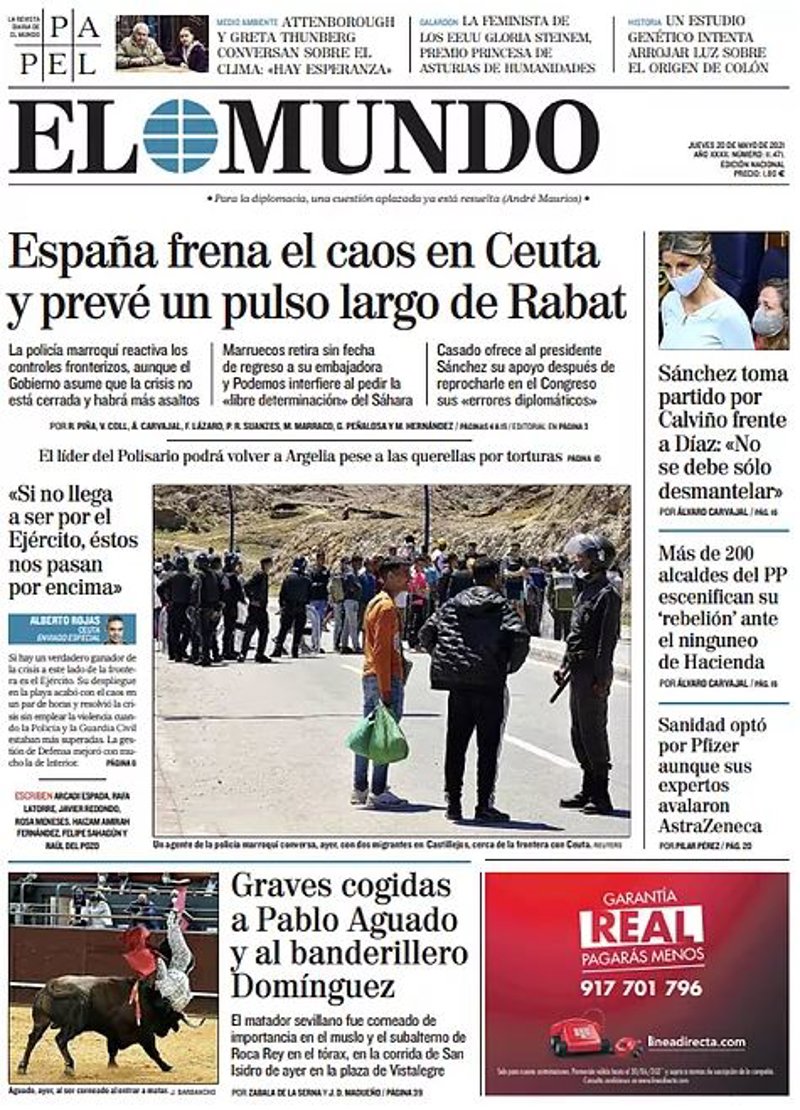 EL MUNDO: "España frena el caos en Ceuta y prevé un pulso largo de Rabat"; "El líder del Polisario podrá volver a Argelia pese a las querellas por torturas"; ""Si no llega a ser por el Ejército, éstos nos pasan por encima""; "Graves cogidas a Pablo Aguado y al banderillero Domínguez"; "Sánchez toma partido por Calviño frente a Díaz: "No se debe sólo desmantelar""; "Más de 200 alcaldes del PP escenifican su 'rebelión' ante el ninguneo de Hacienda"; "Sanidad optó por Pfizer aunque sus expertos avalaron AstraZenece".