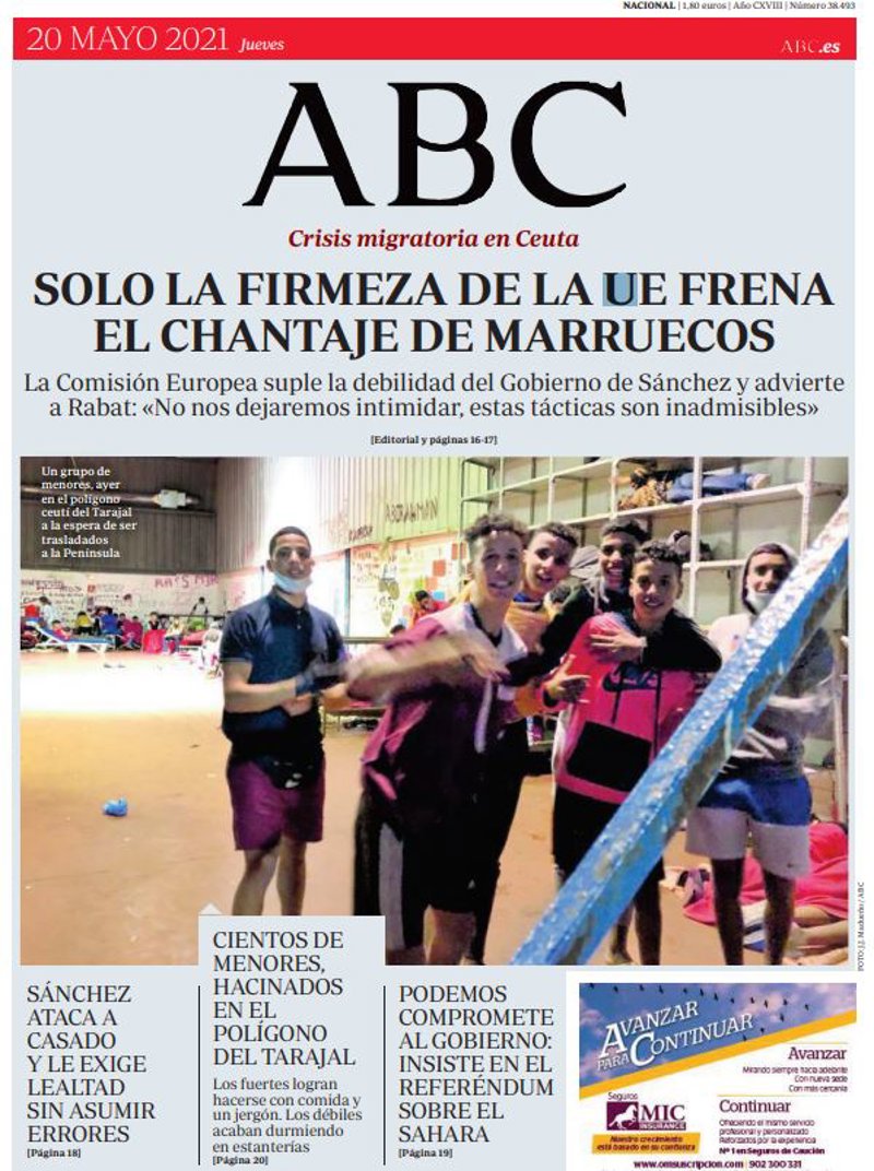 ABC: "Solo la firmeza de la UE frena el chantaje de Marruecos. La Comisión Europea suple la debilidad del Gobierno de Sánchez y advierte a Rabat: "No nos dejaremos intimidar, estas tácticas son inadmisibles""; "Sánchez ataca a Casado y le exige lealtad sin asumir errores"; "Cientos de menores, hacinados en el polígono del Tarajal: "Los fuertes logran hacerse con comida y un jergón. Los débiles acaban durmiendo en estanterías"; "Podemos compromete al Gobierno: insiste en el referéndum sobre el Sáhara".